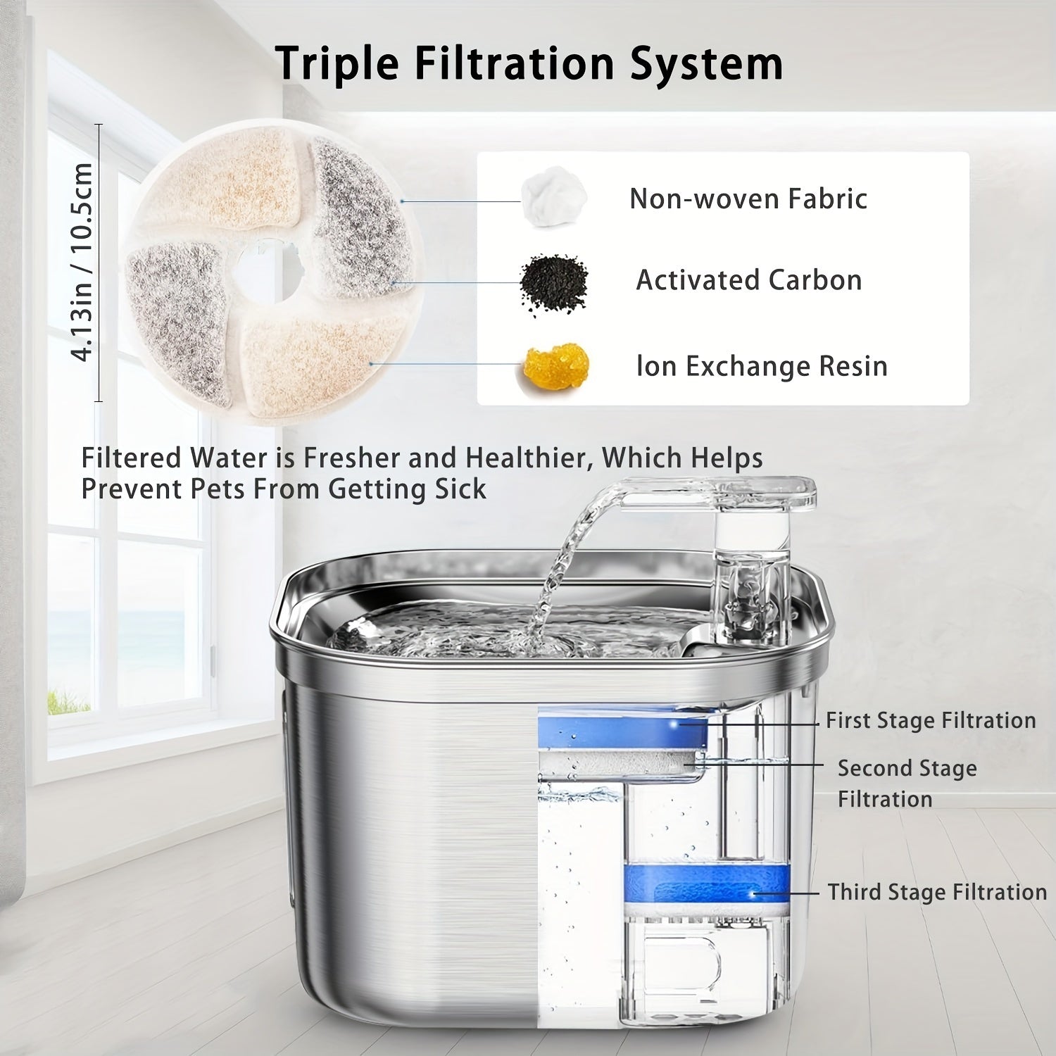 Triple Filtration System: Equipped with 3 filters that combine activated carbon, cotton mesh, and ion exchange resin to purify the water and remove hair, debris, and odors.